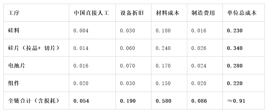中国组件综合制造成本为0.85 - 0.90元/ W。