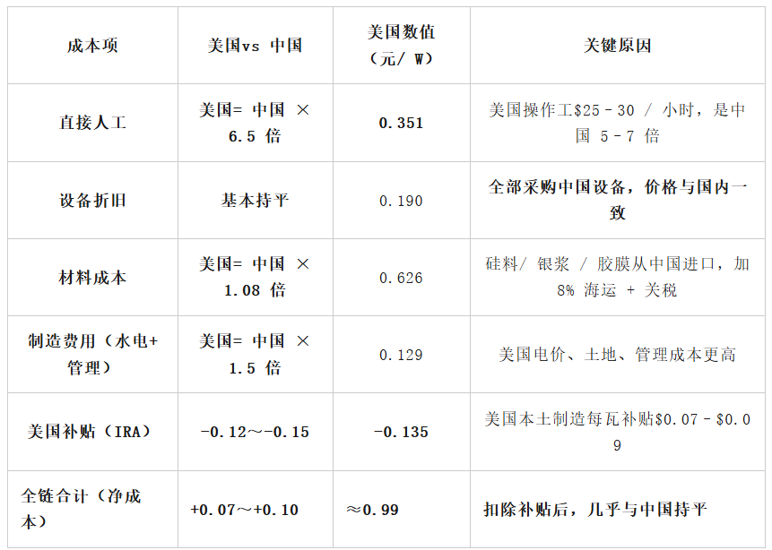 【2深度拆解:扣除运费后,中美光伏成本究竟相差多少?许多人认为:美国生产且人工成本高,其成本必然高于中国。其实未变,马斯克他试图将中美成本差距压缩至近乎为零。以2026年Q1,182mm N型TOPCon组件为基准,进行一次不含运费、仅涉及纯制造端的深度成本对比(单位:元/ W)。